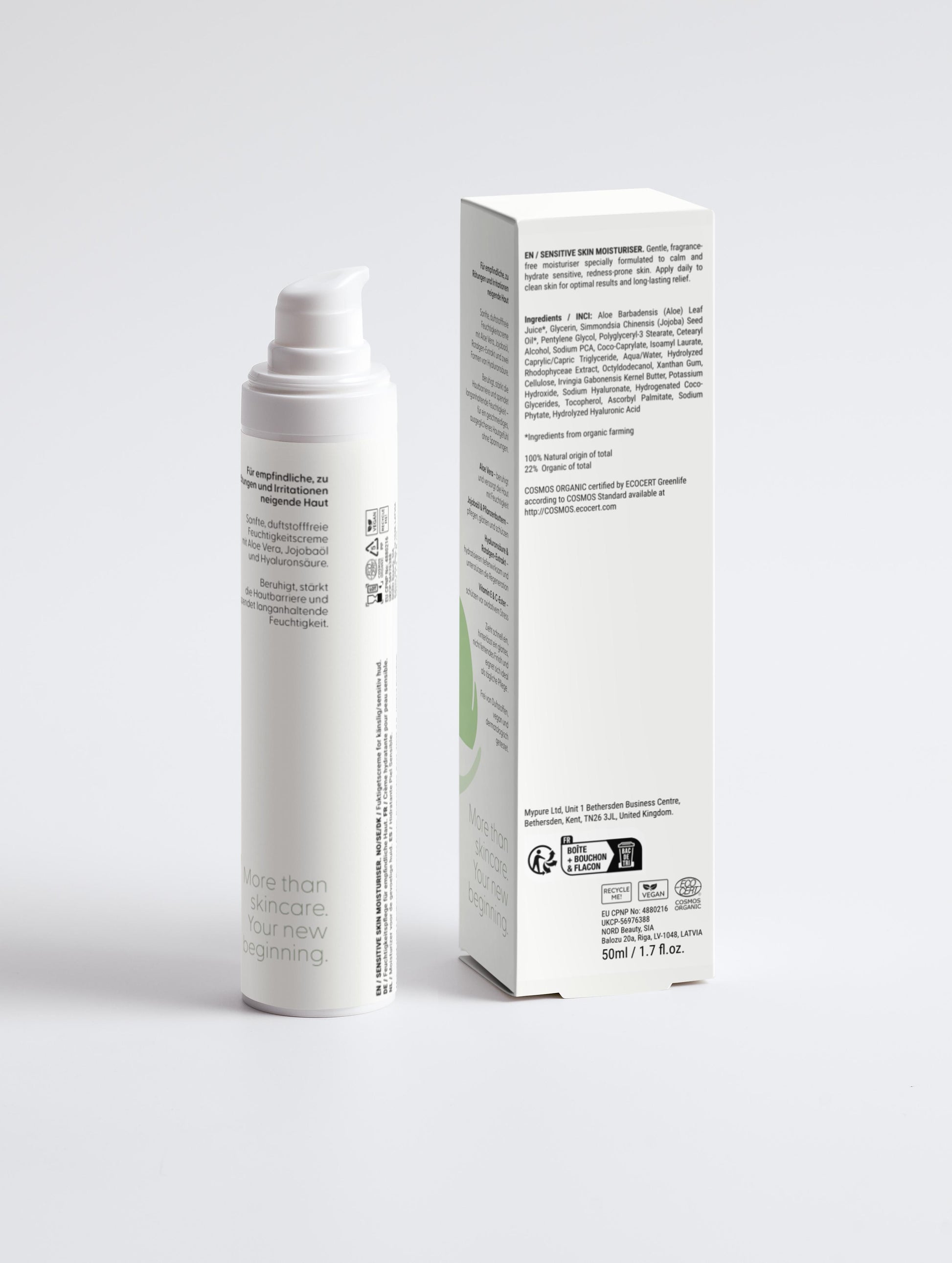 Sanfte, duftstofffreie Feuchtigkeitscreme mit Aloe Vera, Jojobaöl, Rotalgen-Extrakt und zwei Formen von Hyaluronsäure.