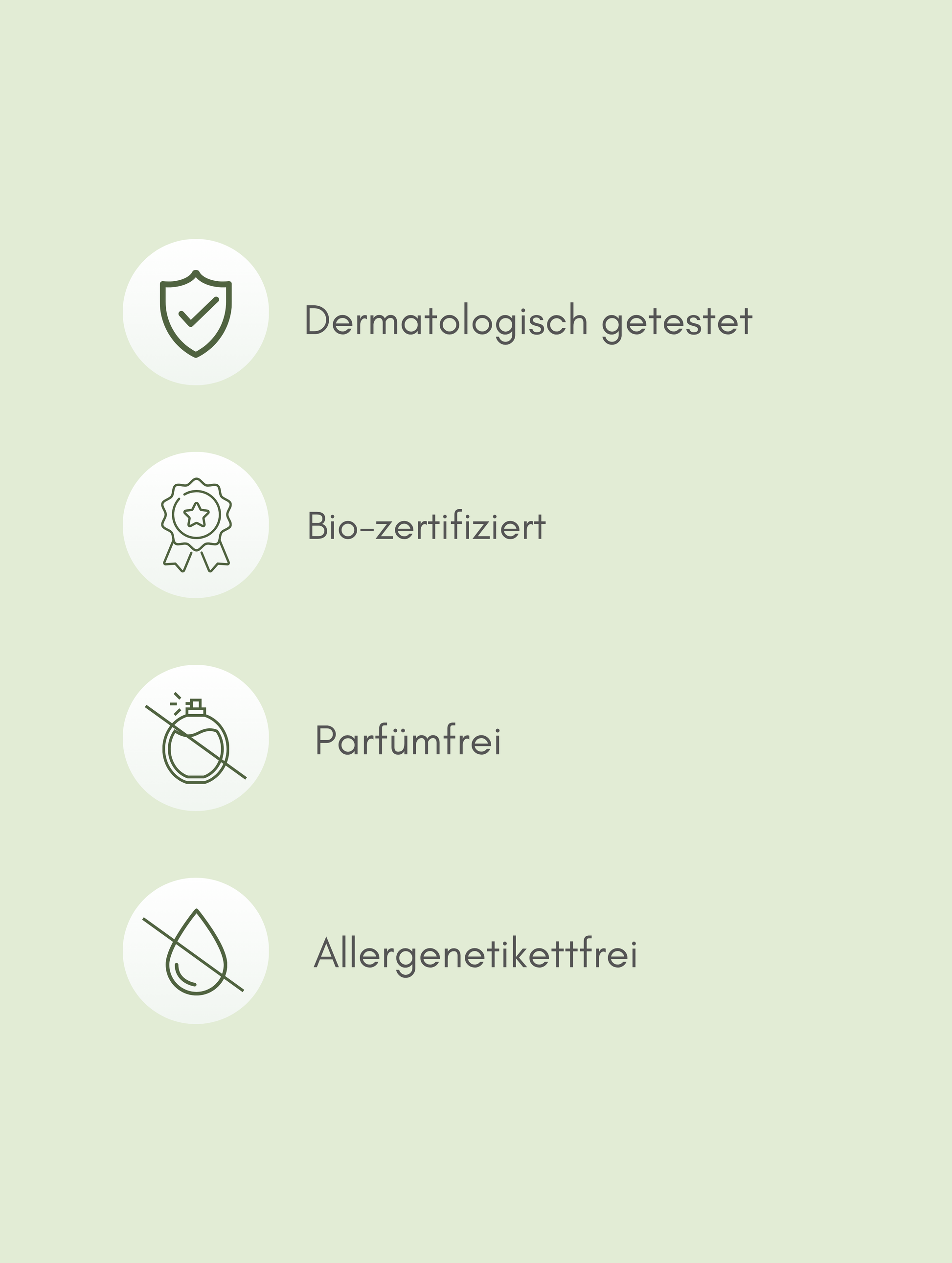 In unseren Hautpflegeprodukten finden Sie keine künstlichen Farbstoffe, synthetischen Duftstoffe, Parabene oder Sulfate.
